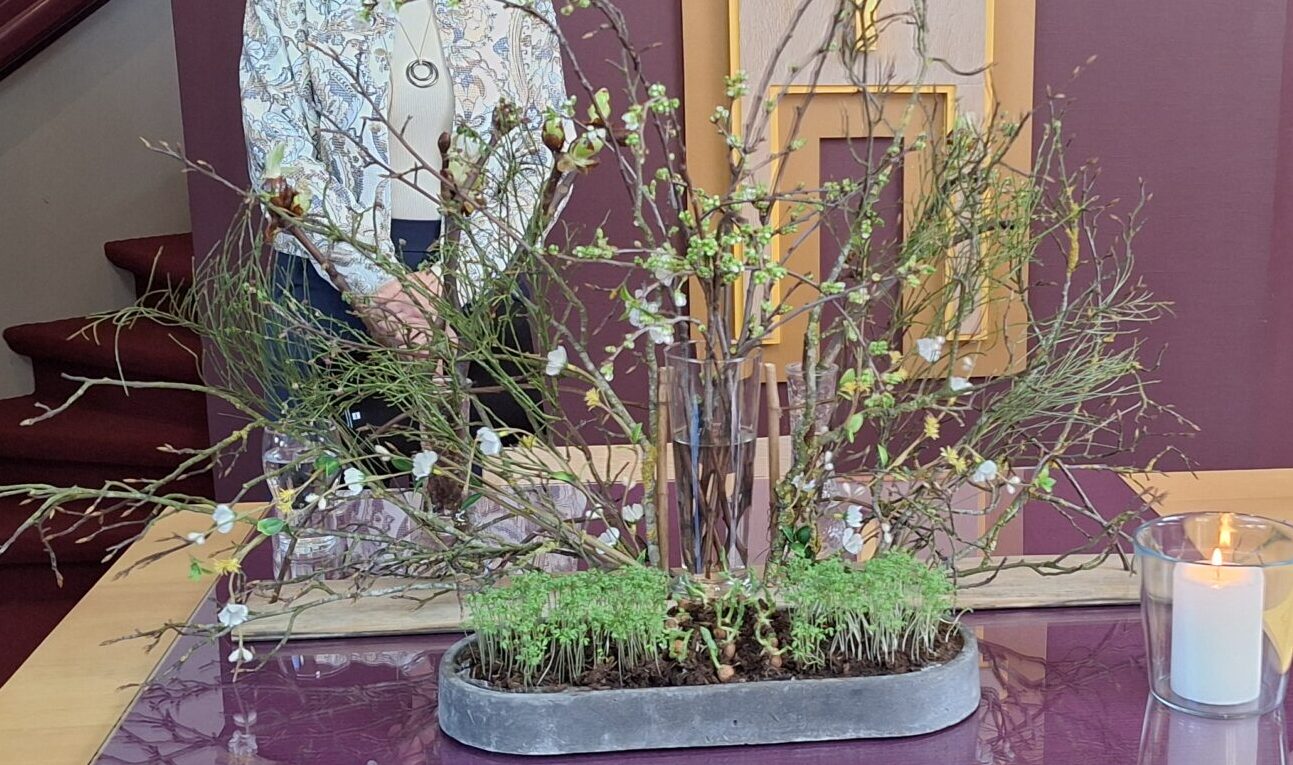 Op de avondmaalstafel staat een schikking waarin de veertigdagentijd en het uitzicht op Pasen wordt gesymboliseerd. Johannes 9 vers 5: