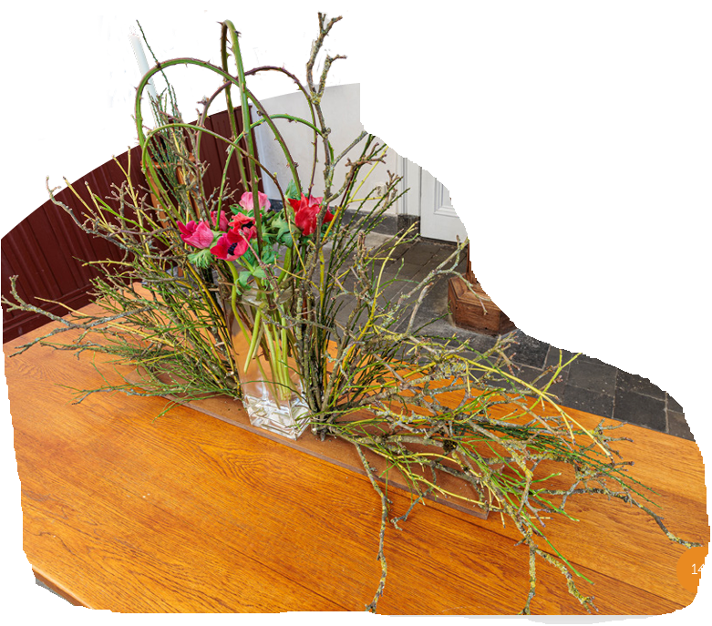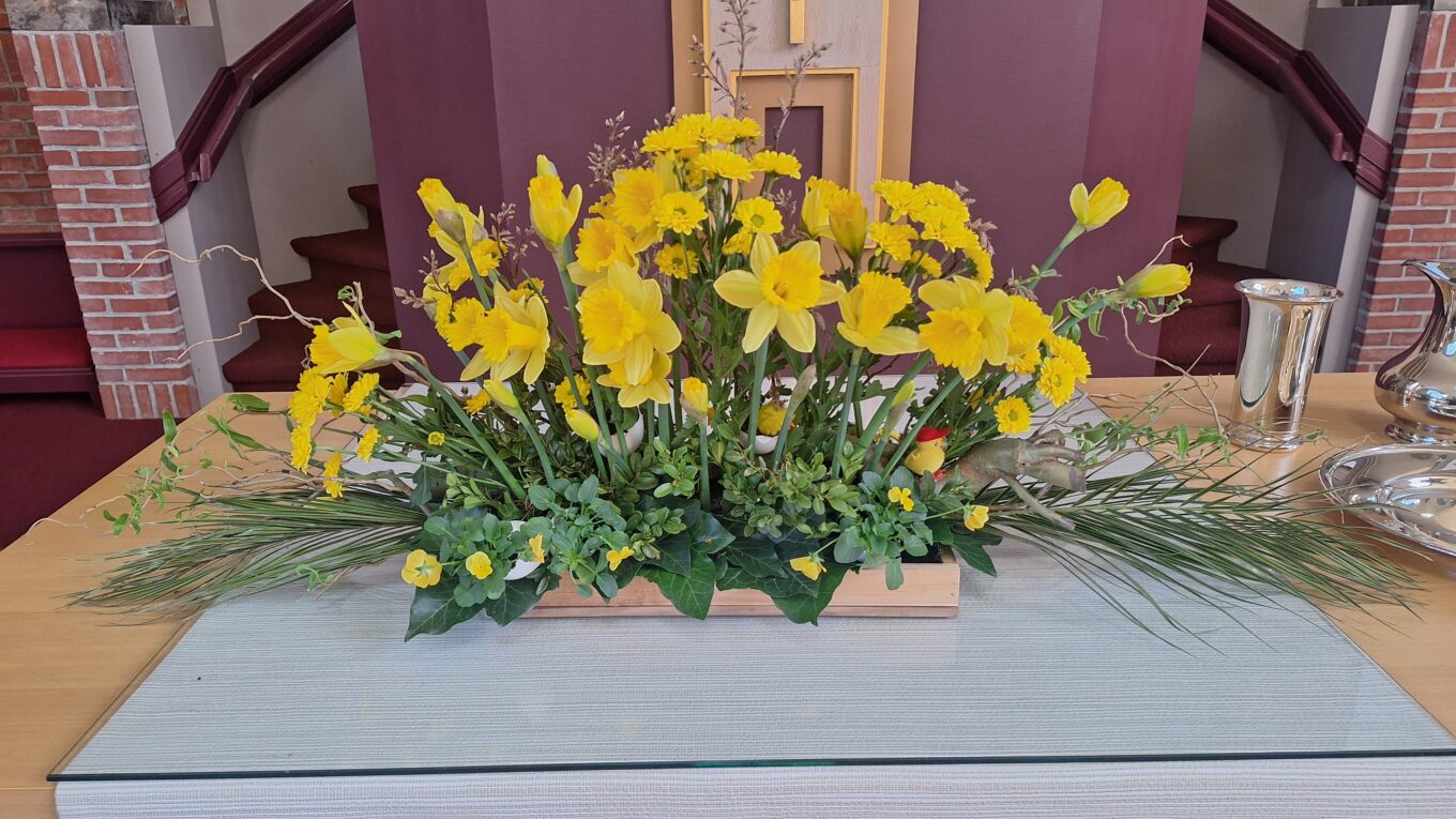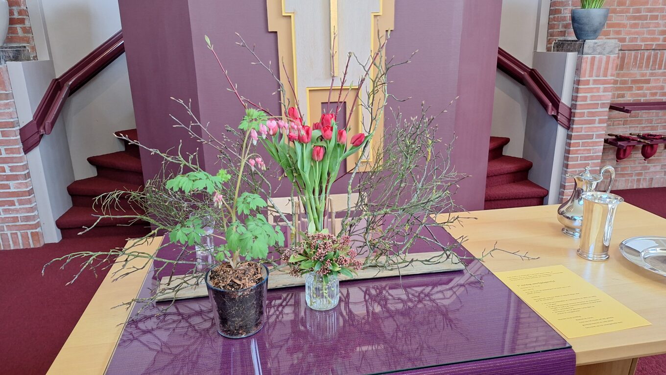 Verder lezenOp de avondmaalstafel staat een schikking waarin de veertigdagentijd en het uitzicht op Pasen wordt gesymboliseerd. Johannes 9 vers 5: