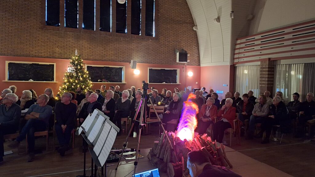 De kerk was verduisterd en sfeervol verlicht. Het vlammenspel in het midden van de kerk voelde als de warmte in de stal van Bethlehem.