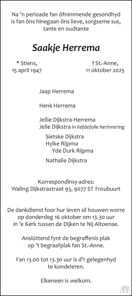 Na ‘n perioade fan ôfnimmende gesondhyd is fan ôns hinegaan Saakje Herrema